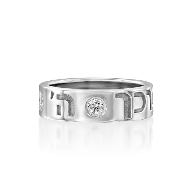 טבעת שומרת עשויה זהב 14K משובצת יהלומים עם הכיתוב מברכת כהנים "יברכך ה' וישמרך" משובצת יהלום בין כל מילה למילה טבעת בעיצוב מיוחד של X LAB DIAMODNS לשמירה ולמזל