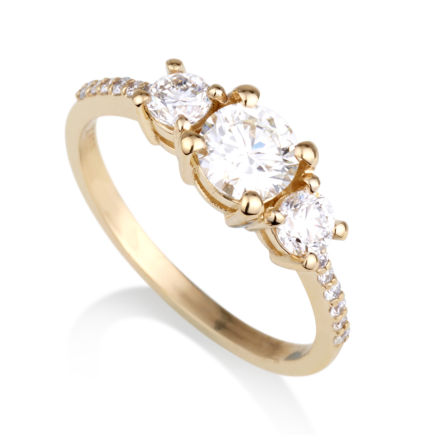 טבעת 3 יהלומים, מזהב 14K משובצת שלושה יהלומים מרכזיים ועוד יהלומים קטנים ונוצצים בצדדים יהלום מרכזי 0.90 קראט טבעת מרשימה ומיוחדת