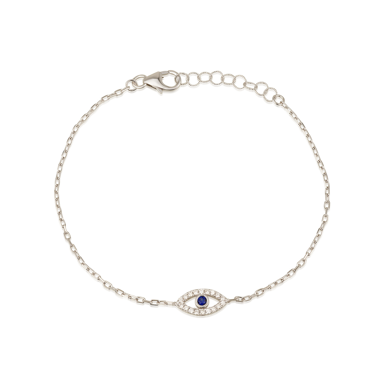 צמיד עין יהלומים קלאסי, הצמיד עשוי מזהב 14K עם שרשרת זהב עדינה. העין משובצת 18 יהלומים עדינים ובמרכזם אבן ספיר כחולה, קטנה ויפה. משקל הצמיד 1.50 גרם.